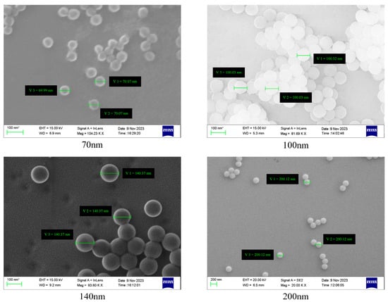 In this study, SEM was used to verify the monodispersity of the PSL suspension. The suspension was first diluted to a specific concentration, after which 1 mL was dispensed onto a clean wafer surface. Following air-drying in a cleanroom, SEM images were conducted to traceably validate the particle sizes of the dried solids. Figure 9 illustrates the SEM characterization results for four characteristic particle sizes: 70 nm, 100 nm, 140 nm, and 200 nm. The scanning results show that the particle sizes of all samples align with their nominal values, with an error of less than 0.5%. The particle size distribution meets traceability requirements, demonstrating the suitability of the suspension as a raw material for preparing monodisperse aerosols and enabling the generation of initial aerosols in the 70–200 nm range.