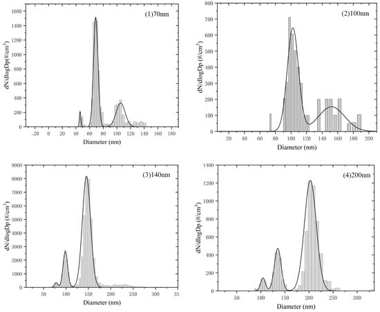 According to the Boltzmann charge equilibrium principle, larger particles have a higher probability of carrying multiple charges. As a result, the secondary peaks become more pronounced for 140 nm and 200 nm aerosol samples. Additionally, for the 70 nm and 100 nm aerosols, peaks also appear at sizes larger than the prominent peaks. This may be due to the presence of oversized particles in the PSL standard suspension or the formation of small aggregates during the atomization process.