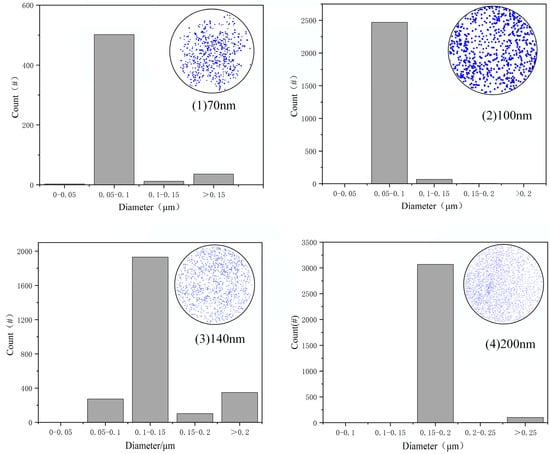 Under the optimized experimental conditions—namely, a nozzle diameter of 4 mm, a deposition height of 15 mm, a chamber volume exceeding 657 cm3, and a rotation speed of 0.314 rad/s—Figure 11 presents the SSIS scans of wafer samples with four different particle sizes, while Table 3 summarizes the corresponding particle counts and deposition efficiencies. The results show that, with the exception of the 70 nm samples, each wafer contained approximately 2000 to 3000 deposited particles, corresponding to a deposition efficiency of approximately 28%. This level of particle loading satisfies the requirements for SSIS calibration.