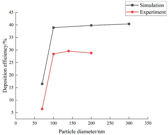Figure 12 compares the deposition efficiency between simulation and experiment for different particle sizes. The data analysis shows that the trend of deposition efficiency with increasing particle size is consistent between the two. However, the simulated results are consistently higher than the experimental results across all particle sizes, with differences ranging from 9.1% to 11.62%. This discrepancy primarily stems from the simplified treatment of kinetic behavior in the numerical simulation compared to actual working conditions.