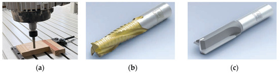 All specimens were uniformly secured to the machine table to minimize movement and vibration during machining, as shown in Figure 1a. The milling process employed two types of Leitz end-mill cutters, each with a 10 mm diameter: one featuring two helical blades, with I.D. 042278 and active cutting length of 25 mm (Figure 1b), and the other with straight blades, with I.D. 038058 and active cutting length of 23 mm (Figure 1c). Both cutters were made of tungsten carbide; however, the helical-bladed tool (T1) was additionally coated with a Marathon layer to enhance performance and durability. Both tools were designed with a positive twist orientation, from the face side of the workpiece toward the bottom, facilitating effective chip evacuation and improved dust extraction. To ensure consistency in the cutting performance, both tools were new, and their blades were microscopically inspected to confirm the absence of any defects.