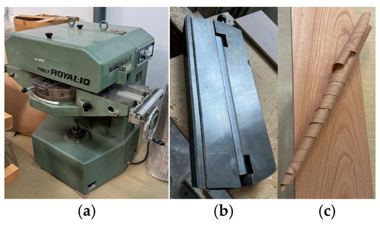 A Marunaka New Royal 10 super surfacer was used in this study (Figure 2a), which is a high-precision Japanese woodworking machine designed for ultra-fine surface shaving. The machine features a 390 mm fixed blade, mounted in a transverse slot on the working table and inclined at 20° relative to the feed direction. This configuration enables a controlled shearing cut as timber is fed longitudinally across the blade.