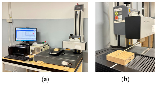 Surface characterization was carried out using the MarSurf XT20 system from MAHR Göttingen GmbH (Göttingen, Germany), equipped with an MFW 250 scanning head (Figure 3a). The instrument features a ±750 µm range tracing arm and a stylus tip with a 2 µm radius and a 90° tip angle. The measurements were conducted at a scanning speed of 0.5 mm/s, with a contact force of 0.7 mN and a lateral resolution of 5 µm. For each sample and CNC cutting parameter combination, four surface profiles of 50 mm were recorded (Figure 3b), all measured perpendicular to the grain direction. For the shaved surfaces, the procedure was the same, but the number of measured profiles was increased to six per sample.