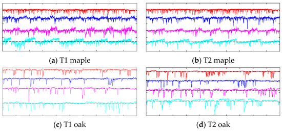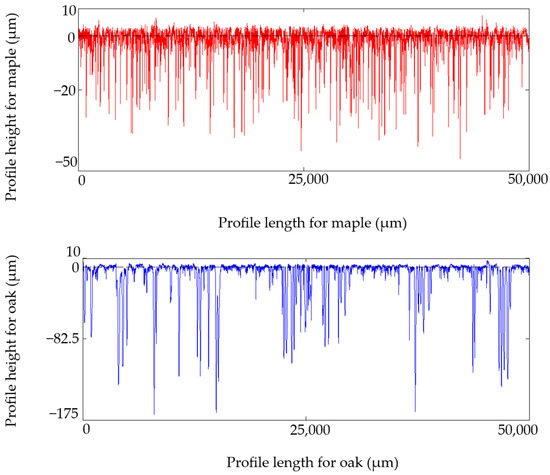 Figure 4 illustrates an example of the corresponding roughness profiles for both species. The red curve represents the maple profile, and the blue curve corresponds to oak. The irregularities observed below the black horizontal axis (the zero line) represent the lumens of wood cells, particularly the vessel voids, emphasizing that the surface topography was anatomically driven rather than mechanically induced. Although y-axis values are displayed, each roughness profile was vertically offset and referenced to its own zero line. This approach was adopted to facilitate a more effective comparison between the two species.