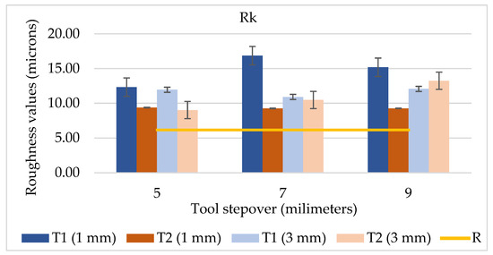 The core roughness Rk increased with an increase in the cutting depth for both tools (Table 5, Figure 11), and this was found significant by ANOVA, especially for values of 5 and 7 mm stepover in the case of T2 and 7 and 9 mm stepover in the case of T1. The increasing roughness with the cutting depth is also visible in Figure 14 and Figure 15.