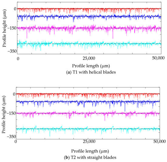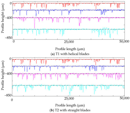 At a cutting depth of 1 mm, the roughness profiles in Figure 7 revealed that the tool T2 (with straight blades) produced a cleaner surface finish compared to T1 (with helical blades).