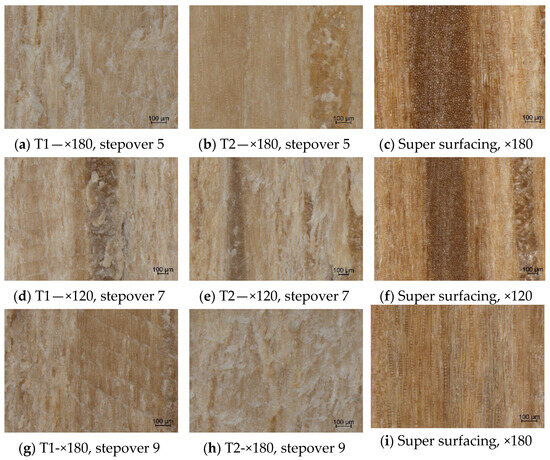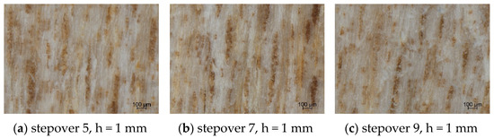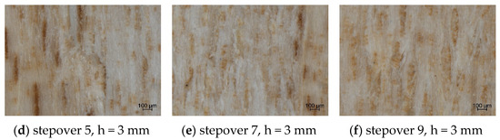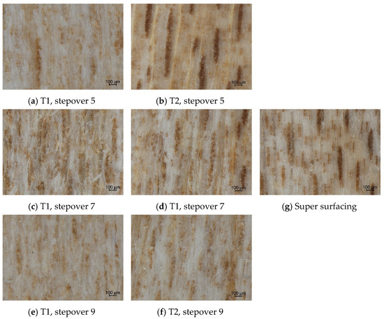 A visual examination of the microscopic images in Figure 15 indicated that for oak processed by the T1 tool, the surface quality decreased with an increase in the stepover and depth of cut. Apart from the pull-out material, the quality was affected by the pronounced ridges imprinted by the T1 tool across the grain.