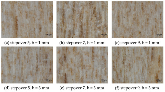 Comparative micrographs of maple processed by T1 for 2 cutting depths and 3 stepover values. Magnification 120×; h represents cutting depth.
