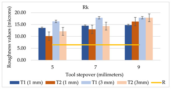 In general, for both cutting depths, the machining surface roughness depicted by the core roughness Rk was significantly smaller for T2 compared to T1 and for all stepover values, with the exception of the stepover of 9 mm at 3 mm depth, with which the surface quality worsened for both tools, leading to no statistical differences between corresponding surfaces. Compared to the reference shaved surface (Rk = 6.16 µm), the Rk values for T2 were the closest (Rk = approximately 9 µm), 33–34% higher for the milled surface for a cutting depth of 1 mm, whereas the surfaces processed by T1 were more than two times rougher.