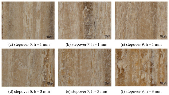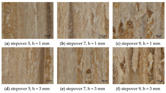 Comparative micrographs of maple processed by T2 for 2 cutting depths and 3 stepover values. Magnification 120×; h represents cutting depth.