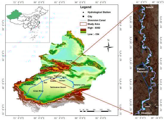 The Tarim River, the longest endorheic river in Asia, is located in the northern Tarim Basin of Xinjiang, China. This composite river system is fed by glacial meltwater from the Tianshan, Karakoram, and Kunlun Mountains. Its mainstem originates at the confluence of the Aksu, Yarkand, and Hotan Rivers near Xiaojiake (adjacent to Alar City) and ultimately drains into Lake Taitema. The main channel extends approximately 1321 km, draining a catchment area of 1.76 × 104 km2, and is classified as a typical plain river [34]. The river reach from Xinqiman to Kelelik is in the upper Tarim River. The river bed slope is 0.19‰ on average, with a height difference of 2.0–4.0m between the floodplain and river channel. The main channel can convey 700–800 m3/s of water [35]. The study reach extends from Area 3 of Tarim Farm (5 km upstream of the Xinqiman Hydrological Station) to Kelelik, with a total length of 171.9 km. The segment from Area 3 of Tarim Farm to the vicinity of Qumaogejin (Paman Reservoir) is classified as a transitional reach, spanning 72.3 km. The downstream segment from Qumaogejin (Paman Reservoir) to Kelelik represents a typical meandering reach, measuring 99.6 km in length [36]. Over the past 32 years, much farmland has been reclaimed along both banks of the Tarim River’s main stream from Xinqiman to Kelelik. The farmland area expanded from 1510 hectares in 1993 to 5140 hectares in 2024. Irrigation primarily relies on water diversion gates and reservoirs along the riverbanks.