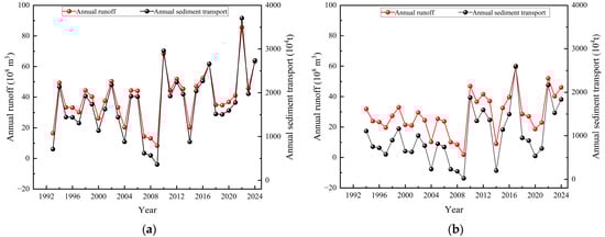 Annual runoff and sediment load changes for the Xinqiman–Kelelik river reach: (a) variations in runoff and sediment from 1993 to 2024 at the Xinqiman Station; (b) variations in runoff and sediment from 1993 to 2024 at the Yingbaza Station.