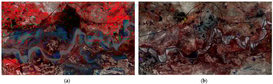 Satellite images of different periods: (a) Satellite image of Paman reservoir reach on 22 August 1994; (b) Satellite image of Paman reservoir reach on 5 May 1995.Two satellite images are synthesized by band. The black lines in the figure represent the study area. The red part is the vegetation on both sides.
