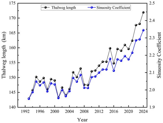 Between 1993 and 2024, the main flow of the river exhibited bidirectional lateral oscillation along the north–south axis. During this period, the length of the thalweg increased from 142.9 km to 171.9 km, and the sinuosity index rose from 1.95 to 2.34, indicating an overall increase in channel meandering. The maximum lateral shift of the thalweg, reaching 2619.4 m, occurred near Kurquol, where channel straightening due to meander cutoff was observed, posing a significant threat to flood control safety for adjacent villages.