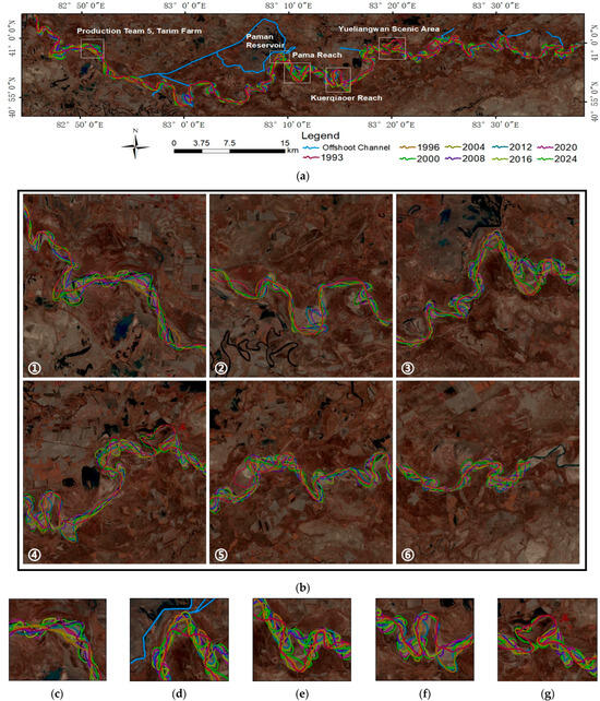Thalweg changes at typical reaches of the Xinqiman–Kelelik segment: (a) the thalweg from Xinqiman–Kelelik section in typical years from 1993 to 2024; (b) the overall thalweg change amplification diagram of the river section, the entire study area is divided into six parts, numbered 1–6 in the figure; (c) the change of thalweg in the Tarim Farm Area 5 reach; (d) the change of thalweg in the Paman reservoir reach; (e) the change of thalweg in the Pama reach; (f) the change of thalweg in the Kuerqiaoer reach; (g) the change of thalweg in the Yueliangwan Scenic Area reach.