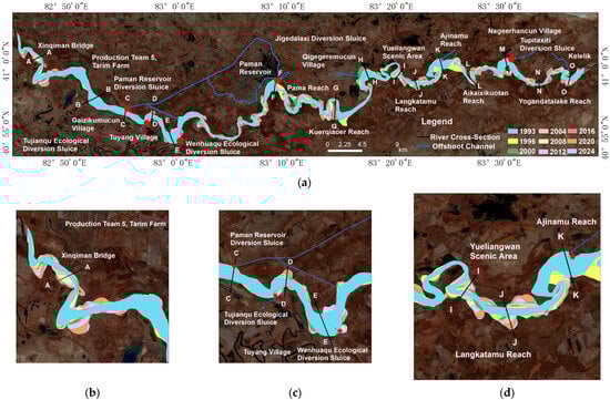 The evolutionary patterns of river systems constitute a critical domain in the study of water–sediment dynamics, particularly in high-sediment-laden rivers, which exhibit pronounced lateral migration characteristics. These river channels demonstrate interannual migration magnitudes on the order of meters. Accurate river regime forecasting is vital for river basin engineering management, covering applications like shoreline protection, engineering safety, and farmland conservation [1]. The Tarim River, located in China’s northwest arid region, is a typical endorheic river basin. It is characterized by an arid climate, fragile ecological environment, and sparse population distribution [2,3]. Historically, due to limitations in transportation and technological methods, long-term field observation data in hydrology, ecology, and other fields have been lacking. Before the 1980s, research relied on limited hydrological and weather station data and manual surveys, with insufficient spatial and temporal data coverage. As for early research methods, in the 1950s and 1960s, the first systematic documentation of river channel morphology and water distribution characteristics was carried out by the Chinese Academy of Sciences expedition team. On this basis, on 8 August 1958, Zhou Tingru and Zhao Ji [4] participated in an investigation of the Tarim River by the Xinjiang Comprehensive Investigation Team of the Chinese Academy of Sciences, and studied the issues of water resources, soil salinization and wind prevention and sand returning in the Tarim River.