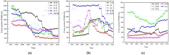 Since satellite imagery cannot obtain the cross-sectional shape of the river channel, this study only analyzes the change of the river channel width based on the river channel plane. Figure 7 shows the annual changes in the width of each typical cross-section. Based on the morphological evolution characteristics and driving mechanisms of the river cross-sections, the typical cross-sections were classified. Cross-sections BB, CC, EE, FF, and MM are categorized as meander-driven water-sediment differentiation types, as shown in Figure 7a, and are designated as Type I cross-sections. Cross-sections AA, II, JJ, KK, and OO are classified as engineering-flood composite disturbance types, as shown in Figure 7b, and are designated as Type II cross-sections. Cross-sections DD, GG, HH, LL, and NN are categorized as mixed evolution types, as shown in Figure 7c, and are designated as Type III cross-sections.