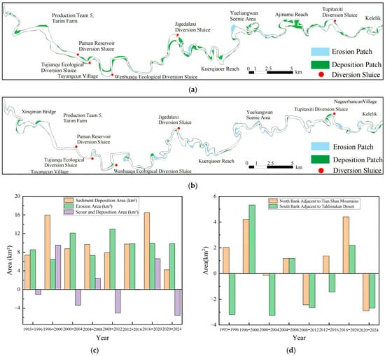 The scouring and silting conditions of the Xinqiman–Kelelik reach from 1993 to 2024: (a) erosion and accumulation patches in Xinqiman–Kelelik reach from 1996 to 2000; (b) erosion and accumulation patches in Xinqiman–Kelelik reach from 2020 to 2024; (c) river erosion and deposition area; (d) erosion and deposition area on both sides of the river. (note: + represents siltation; − represents erosion).