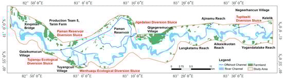Distribution of farmland and locations of ecological water diversion sluices along the Xinqiman–Kelelik river reach.