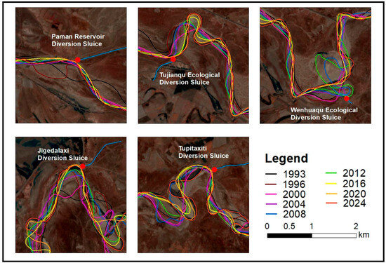 The Tarim River serves as the lifeline for agriculture and ecosystems in the arid regions of southern Xinjiang. River channel evolution is a fundamental aspect of natural fluvial processes, and its dynamic changes directly affect the feasibility and sustainability of ecological water diversion along both banks, thereby influencing agricultural production and ecological conditions in the surrounding The Xinqiman–Kelelik reach of the Tarim River traverses Shaya County and Kuche City. The water resources of the Tarim River are crucial for sustaining the agricultural systems and fragile ecological balance in these regions. Within this reach, there are five ecological diversion gates, namely the Paman Reservoir Diversion Sluice, Tujianqu Ecological Diversion Sluice, Wenhuaqu Ecological Diversion Sluice, Jigedalaxi Diversion Sluice, and Tupitaxiti Diversion Sluice (Figure 9). These sluices are responsible for irrigating 22,100 hectares of farmland and 68,700 hectares of ecological land in the region. Therefore, it is crucial to investigate the impact of river evolution on these ecological diversion gates.