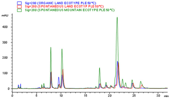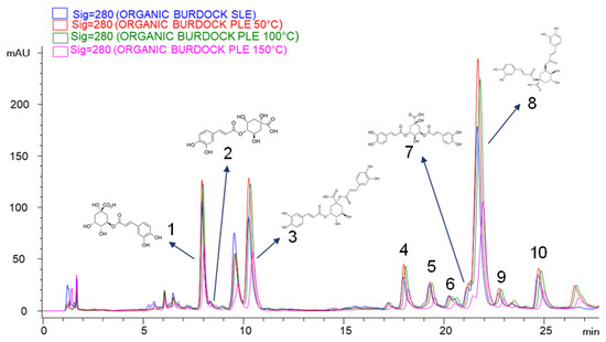After qualitative analysis, quantitative differences among the extractions were determined by HPLC-DAD-IT-MS using caffeoylquinic acid standards. Figure 1 shows the HPLC-DAD chromatograms (at 280 nm, corresponding to the phenolic compounds) recovered from SLE and PLE at 50, 100, and 150 °C extracts of the organic burdock ecotypes.
