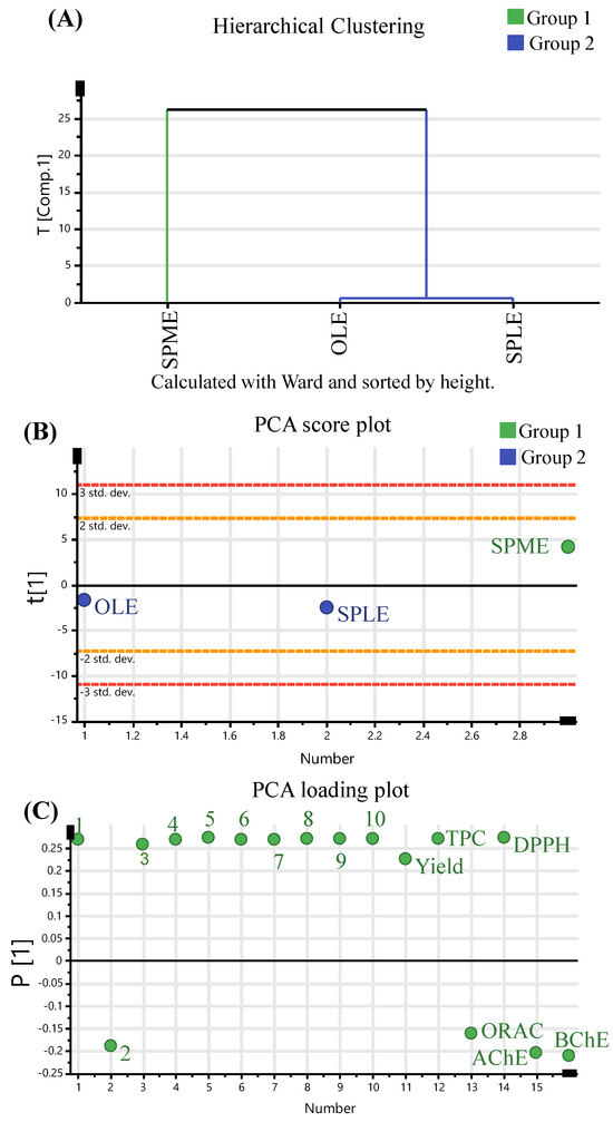 To assess the contribution of each quantified phenolic compound to the bioactivity of the extracts, a multivariate statistical analysis was performed. The burdock root extracts were categorized into groups based on similarities in extraction yield, TPC, antioxidant and anticholinergic capacities, and the phenolic composition identified by HPLC-DAD. Hierarchical Cluster Analysis (HCA) (Figure 3A) revealed the formation of two distinct clusters, where one cluster grouped the SPME extract (green type), while the SPLE and OLE extracts were classified into a second cluster (blue type).