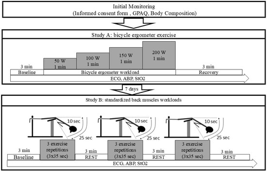 Study B (Figure 1): The subjects performed three sets of exercise for the back muscles, consisting of trunk extension exercise performed on a back extension bench supported by a trainer. Before the measurements began, the ECG electrodes were applied to the participant’s body and participants sat and rested for 30 min to assure stable baseline readings. Resting parameters were collected at the end of 30 min. After the test, the participants rested for 3 min while ECG data were continuously recorded for recovery analysis. The torso-stretching movement was performed for 10 s and the return to the starting position (torso bending movement) for 20–25 s (Figure 1), with three repetitions. Between each repetition, the subjects rested for 3 min while standing. After the exercise, the subjects rested for 3 min to monitor recovery. ECG measurements and the change in StO2 in the muscle (erector spinae) were recorded continuously throughout the study; ABP was measured at the end of each set.