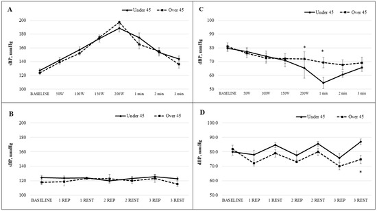 Figure 3 shows that at the onset of exercise, sBP in Study A progressively increased with each stage of the bicycle ergometer test and decreased during the recovery period. In Study B, sBP values returned close to baseline during the rest intervals between repetitions. No statistically significant differences in sBP were observed between age groups at any stage of testing or recovery. At baseline, sBP in Study A was 127.3 ± 2.6 mmHg in participants under 45 years of age and 124.0 ± 2.9 mmHg in those over 45. The highest values were recorded at the 200 W workload, reaching 188.8 ± 5.9 mmHg in the younger group and 197.2 ± 4.0 mmHg in the older group.