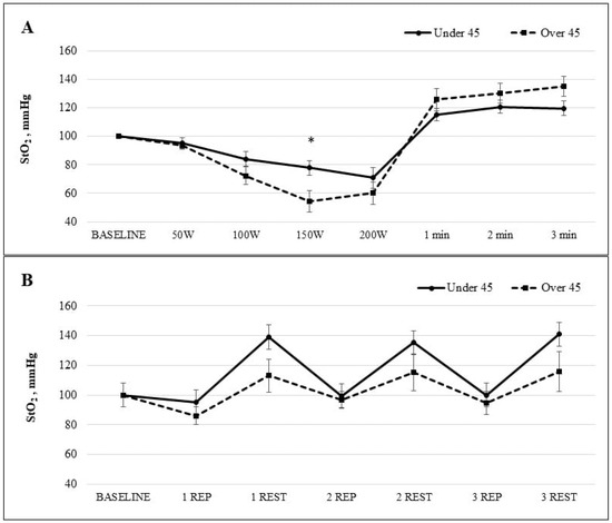 Figure 5 presents the dynamics of StO2 during both the exercise and recovery phases. In Study A, as the workload on the bicycle ergometer increased incrementally each minute, a decline in StO2 was observed in both age groups. Upon reaching a workload of 150 W, the mean StO2 value in participants under 45 years of age was 77.8 ± 5.3%, whereas in those over 45 years of age it was 54.4 ± 7.7%, with a statistically significant difference between the groups (p < 0.05). During the recovery phase, StO2 values in both groups exceeded baseline levels. In the younger group (<45 years), the peak value was recorded in the second minute post-exercise (120.7 ± 4.6%), while in the older group (≥45 years), the highest value occurred in the third minute of recovery (135.1 ± 7.1%). The study results showed that StO2 levels were higher in participants over the age of 45 compared to younger individuals. The calculated effect sizes indicate a strong age-related impact on muscle oxygenation dynamics both during physical exertion and in the recovery period.