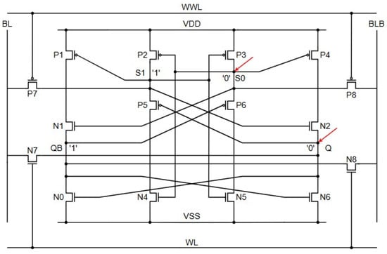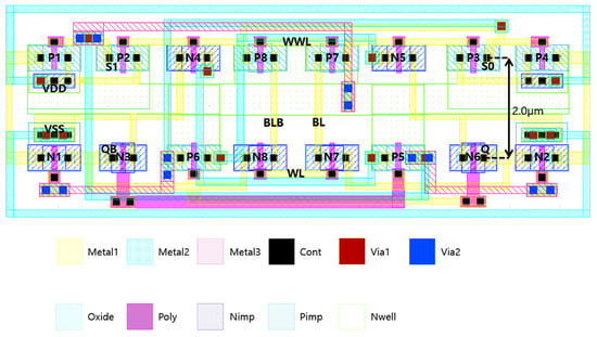 Figure 2 presents its corresponding layout. The EWS-16T cell is designed with a dual-access architecture to enhance write performance while maintaining high radiation tolerance. It comprises two storage nodes (Q and QB) and two internal nodes (S1 and S0). Transistors P7 and P8 are controlled by the write word line (WWL) and connect the internal nodes S1 and S0 to the bit lines BL and BLB, respectively. Meanwhile, transistors N7 and N8 are controlled by the word line (WL) and connect the storage nodes Q and QB to the bit lines BL and BLB. When the stored data in the cell represents logic ‘1’, nodes Q and QB hold logic values of ‘1’ and ‘0’, respectively, and internal nodes S0 and S1 store logic values of ‘0’ and ‘1’. This complementary storage structure allows robust data retention and controlled feedback operation within the cell.