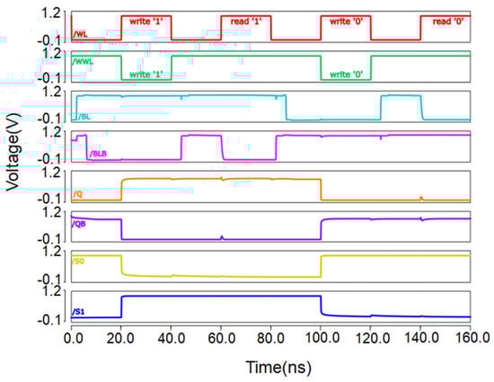 This section presents the simulation setup and evaluation results of the proposed EWS-16T cell, implemented using a 90 nm CMOS technology. All simulations were performed with an operating voltage of 1.0 V and an ambient temperature of 27 °C. Identical simulation conditions were applied to all evaluated cells to ensure fairness in comparison. The cell is composed of 16 transistors, and the transistor sizing is carefully optimized for enhanced write performance and power efficiency. Transistors P1–P6 and N1, N2, N4, and N5 are set to the minimum width to achieve a compact cell area. Pulldown transistors N3 and N6, which are connected to internal nodes, are sized to 1.8 times the width of their respective access transistors. Access transistors N7 and N8 are sized to 1.08 times the minimum width. Furthermore, the PMOS pull-up transistors P7 and P8, which are connected to the storage nodes, are set to 1.7 times the width of the access transistors. This sizing helps reduce the write access time and improve the charging path, thereby enhancing overall write performance.