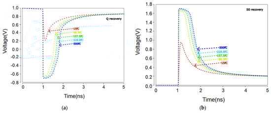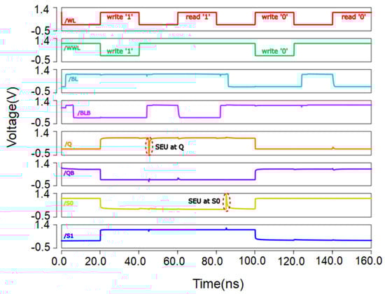 Therefore, a node storing logic ‘1’ and surrounded by NMOS transistors, or a node storing logic ‘0’ and surrounded by PMOS transistors, is considered to be SEU-sensitive. When node Q holds logic ‘1’ in the EWS-16T cell, its complementary node QB stores logic ‘0’ and is exclusively connected to NMOS transistors. This configuration permits only a “0” to “0” transition at QB, making it inherently immune to state flipping and thus classified as a non-sensitive node. Likewise, the internal node S1 retains logic ‘1’ and is surrounded by PMOS transistors, allowing only a “1” to “1” transition. S1 is therefore also considered non-sensitive. Q holds logic ‘1’ while being connected to NMOS transistors, and S0 stores In contrast, Q holds logic ‘1’ and is connected to NMOS transistors. S0 stores logic ‘0’ and is connected to PMOS transistors. This configuration satisfies the condition under which SEUs can induce logic inversion, thus classifying Q and S0 as sensitive nodes. The transient responses and recovery behaviors at these sensitive nodes are illustrated in