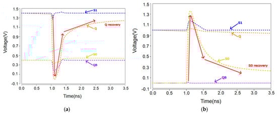 If both nodes Q and S0 are simultaneously affected by an SEMNU, resulting in transitions from “1” → “0” and “0” → “1”, respectively, transistors P5 and N4 are turned on, while P2 is turned off. This causes node S1 to discharge through P5 and N4, leading to a state change from ‘1’ to ‘0’. Subsequently, P1 turns on and remains active, allowing node Q to be recharged from ‘0’ to ‘1’ via P1 and N1. However, during this process, the internal state of the feedback loop changes, resulting in a corruption of the originally stored data. Hence, if a sufficiently large charge is deposited simultaneously at nodes Q and S0, self-recovery to the original logic state becomes impossible.