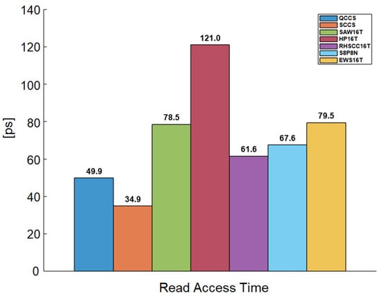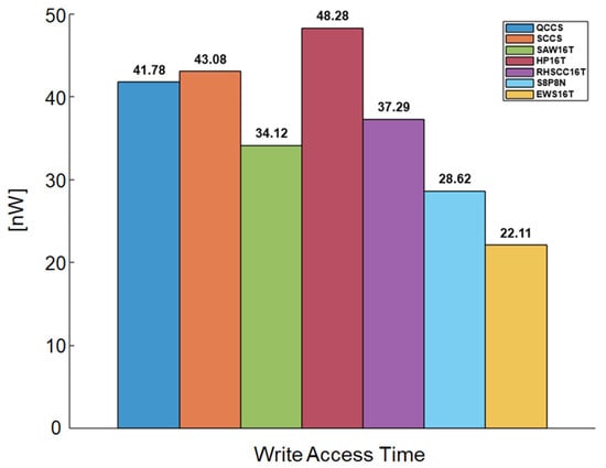 The proposed EWS-16T employs a dual-access transistor structure composed of both PMOS and NMOS transistors, enabling simultaneous and fast control of the storage nodes (Q, QB) and the internal nodes (S0, S1). This bidirectional conduction structure facilitates rapid voltage inversion during write operations, effectively reducing the WAT. Furthermore, the cell is initialized with a weak ‘1’ at the storage node and a weak ‘0’ at the internal node, allowing reliable switching with minimal charge disturbance. In addition, the PMOS pull-up transistors connected to the storage node are sized to be 1.7× wider than the access transistor, making the storage node weaker and thus allowing the access transistor to discharge the ‘1’-storing node more effectively. According to experimental results, the proposed EWS-16T achieves a WAT of 22.11 ps, which is 1.89×, 1.95×, 1.54×, 2.17×, 1.69×, and 1.29× faster than QCCS, SCCS, SAW16T, HP16T, RHSCC16T, and S8P8N cells, respectively.