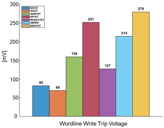 Figure 7 compares the WWTV of various SRAM designs, including QCCS, SCCS, SAW16T, HP16T, RHSCC16T, S8P8N, and the proposed EWS-16T cell. Higher WWTV indicates stronger internal node controllability, enabling more reliable and efficient writes. As shown, cells with longer write access times generally show lower WWTV, while those with faster write access times achieve higher WWTV, confirming the correlation between write speed and dynamic writability. The proposed EWS-16T, with its dual-access structure and optimized PMOS pull-up ratio, achieves the highest WWTV while also exhibiting the shortest WAT among all comparison cells. These features highlight its excellent internal drivability and write efficiency under dynamic conditions. However, this enhancement in writability achieved by upsizing access and pull-up transistors to increase WWTV also weakens the storage node, making it more susceptible to voltage disturbance during reads and thus reducing RSNM. This trade-off arises because stronger write paths lower the voltage margin necessary for stable read sensing. To address this, careful transistor sizing and selective feedback control are required to improve RSNM without significantly compromising write performance. Experimental results show that EWS-16T achieves a WWTV of 279 mV, which is 3.40×, 4.04×, 1.76×, 1.11×, 2.20×, and 1.30× higher than QCCS, SCCS, SAW16T, HP16T, RHSCC16T, and S8P8N, respectively. These results confirm its superior dynamic write stability and robustness for SRAM applications.