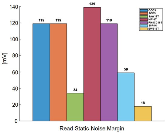 Figure 9, the EWS-16T cell exhibits a lower RSNM than other comparison cells such as QCCS, SCCS, SAW16T, HP16T, RHSCC16T, and S8P8N. This indicates that while the proposed design delivers strong write performance through its dual-access structure and optimized pull-up ratio, its read stability is comparatively limited due to the added complexity of its internal node structure and feedback paths. To enhance RSNM, read-assist techniques such as negative bitline (NBL) or boosted word line can be employed to increase the voltage differential between bitlines during read operations [