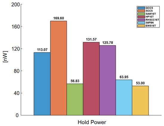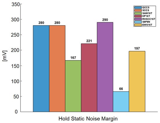 Figure 11, the EWS-16T cell achieves a hold power of 53 nW, which is 2.13×, 3.20×, 1.07×, 2.48×, 2.37×, and 1.20× lower than those of QCCS, SCCS, SAW16T, HP16T, RHSCC16T, and S8P8N, respectively. These results confirm that the EWS-16T cell outperforms conventional radiation-hardened SRAM designs in terms of power efficiency during idle states. Through these structural and electrical optimizations, it can be concluded that the EWS-16T cell effectively suppresses leakage current even in hold mode, achieving significantly improved low-power operation suitable for space applications.