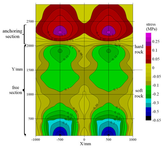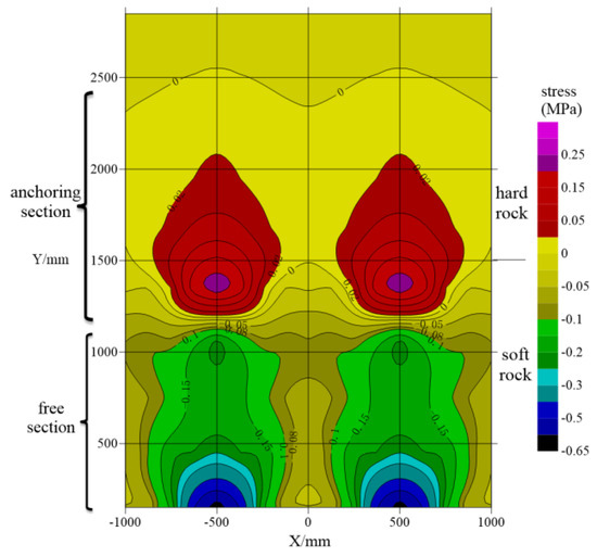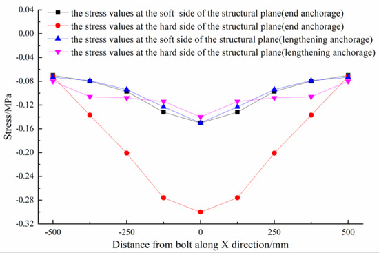 The stress distribution of surrounding rock near the structural plane is shown in Figure 5. When the anchorage section is in hard rock, the stress values at the soft and hard sides of the structural plane are quite different, and the stress value of the hard rock side is significantly higher than that of the soft rock side. The compressive stress near the structural plane decreases rapidly along the anchor bolt diffusion direction. Taking the compressive stress at the X = 125 mm location at the hard rock side of the structural plane as the benchmark, the compressive stress at 250 mm, 375 mm, and 500 mm locations from the bolt body decreases by 27.1%, 50.4% and 73.9%, respectively, showing a law of linear attenuation. Taking the stress at the x = 125 mm location at the soft rock side as the benchmark, the compressive stress at 250 mm, 375 mm and 500 mm locations from the bolt body decreases by 26.5%, 39.4% and 46.9%, respectively, and the reduction amplitude decreases rapidly near the bolt and slowly far from the bolt, showing a law of exponential attenuation. Considering the diffusion range of compressive stress, the anchoring effect of the anchoring section in hard rock is better than that in soft rock.