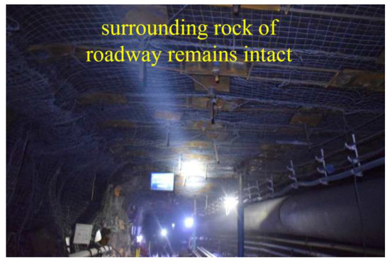 For the hard intercalated roof, 0~0.9 m above the roof is mudstone with an average strength of 21 MPa, 0.9~1.8 m above the roof is fine-grained sandstone with an average strength of 57 MPa, and 1.8 m above the roof is mudstone with an average strength of 29 MPa, which are distributed in the form of “soft–hard–soft” along the direction of anchor bolt. According to the research results, the anchorage section should be located in the hard rock, which can ensure the anchoring force of the bolt and increase the prestress diffusion range of the anchor bolt. Moreover, the lower part of anchorage section should avoid the structural plane of the surrounding rock. The drilling length of anchor bolt is 2300 mm, and the anchorage section should be more than half of the range of fine sandstone. Therefore, the anchorage length should be 1000 mm−1400 mm. MSK2335 and a MSZ2360 anchoring cartridges are used for anchoring according to the design, and the anchoring length is 1210 mm.