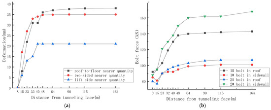 Roadway support and mine pressure monitoring are shown in Figure 10 and Figure 11. According to the stress situation of the anchor bolt, the initial pretightening force of the bolt is within the range of 80~92 kN, which basically meets the design requirements; after applying high pretightening force to the bolt, the stress is basically stable with a very small change. The maximum stress of the bolt is no more than 168 kN, reaching 88% of the yield strength of the bolt, which is within the reasonable range of the bolt stress. The roadway deformation increases gradually with the increase in driving distance. Within 50 m from the heading face, the increase in amplitude is relatively large, the average increment of the two sides is 7 mm/d, and the average increment in the roof and floor is about 6 mm/d. The deformation tends to be stable with the increasing distance away from the heading face. The maximum convergence of roof and floor is 35 mm, the maximum convergence of the two sides is 38 mm, and the maximum convergence of the left side is 21 mm. Through analyzing the observation curve of roadway surface displacement, it can be seen that the overall deformation during crossheading is small, which indicates that the deformation of roof and surrounding rock at both sides is controlled in the initial stage, and the supporting measures are effective.