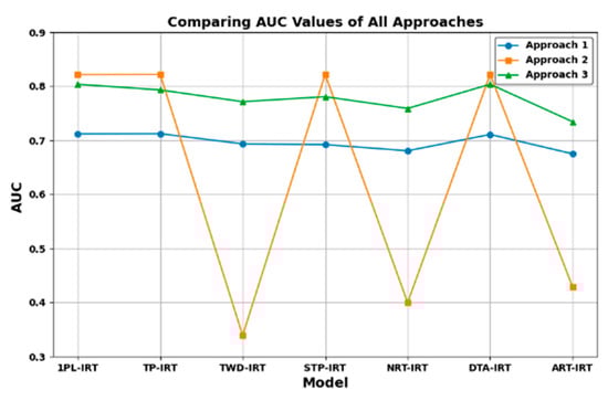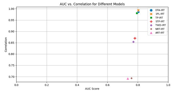 • AUC (Area Under the Curve): The AUC measures the model’s ability to distinguish between correct and incorrect responses. It is particularly useful for handling imbalanced datasets, where the proportion of correct and incorrect responses may vary significantly across items. For each item, the AUC was calculated by comparing the predicted probabilities of correct responses (derived from the model’s logit function) against the observed binary responses. The final AUC score was computed as the average across all items.