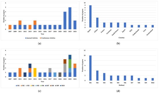 As shown in Figure 2a and Table 3, a total of N = 24 published documents (from journals and conferences) were identified between 2007 and 2024. Although only a few papers were published in the early years, the number of publications has increased significantly after 2022, indicating growing attention to the subject.