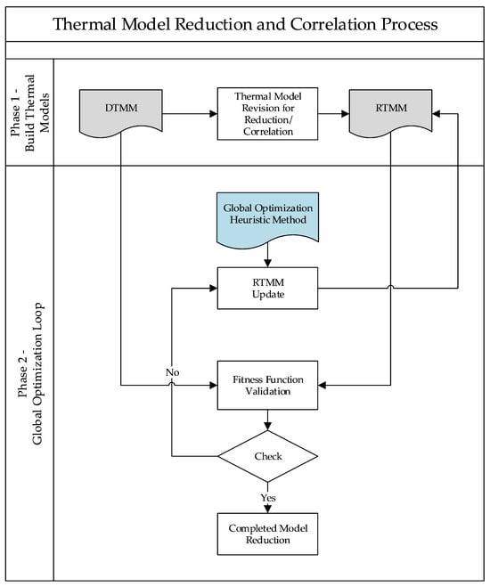 The application of a heuristic method for global optimization in the thermal model reduction and correlation process is structured in two distinct phases, as illustrated in Figure 3: Phase 1—Build Thermal Models and Phase 2—Global Optimization Loop.