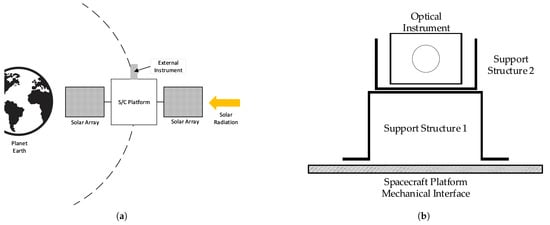 Aerospace instrument concept design illustration: (a) orbit of a satellite with an external instrument. (b) External instrument concept design where the Spacecraft Platform Mechanical Interface is attached to Support Structure 1, which is connected to Support Structure 2, which supports the Optical Instrument at its top.