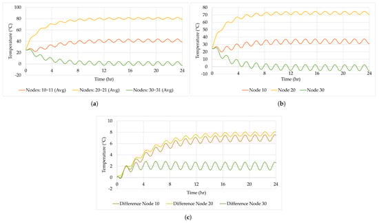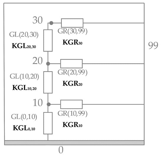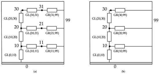 Figure 5a,b present the Thermal Resistance Networks for the detailed thermal mathematical model (DTMM) and the reduced thermal mathematical model (RTMM), respectively. Although the DTMM shown in Figure 5a is already a simplified thermal model, it is still referred to as the “detailed” model in this study because it serves as the reference for evaluating the reduced model’s accuracy. As discussed in the Introduction (Section 1) and similar to the approach by Klement [], it is necessary to define both a reference model (DTMM) and a reduced model (RTMM), where the RTMM has fewer nodes but still captures the key thermal behaviour of the DTMM. Despite the simplicity of the DTMM, the process of reducing and correlating the RTMM is difficult.