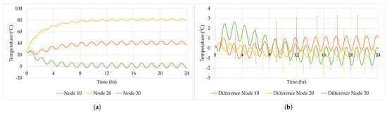 The thermal model represents an optical instrument mounted on an external panel of a satellite operating in low Earth orbit (LEO). As shown in Figure 4a, the satellite is depicted using a simple schematic for an external instrument configuration, orbiting the Earth with a 90-min period. During its orbit, the satellite is exposed to solar radiation when it is outside Earth’s shadow, while the external panel radiates heat into deep space and exchanges thermal energy with the satellite’s internal components.