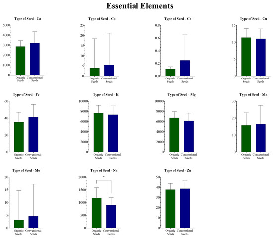 Essential elements (mg/kg) in organic and conventional flaxseed samples. * Statistically significant difference (p < 0.05).