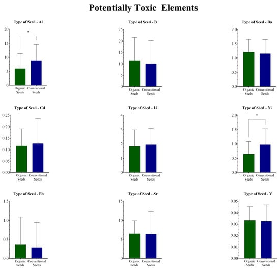 When grouped by seed type (Figure 1 for essential elements and Figure 2 for potentially toxic elements), t-tests and Mann–Whitney tests revealed that metal concentrations varied between organic and conventional seeds for certain elements. Al and Ni exhibited higher levels in conventional flaxseeds compared to organic flaxseeds (p = 0.0312 and p = 0.0142, respectively). Moreover, Na showed a decrease in concentration in the conventional samples compared to the organic group (p = 0.0072).