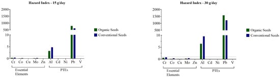Table 3 presents the estimated daily intake (EDI) of each element based on daily flaxseed consumption of either 15 g/day or 30 g/day. The highest EDI values were observed for K, Mg, and Ca, respectively. Hazard index (Figure 3) values above 1 were observed for Al and Pb in both exposure scenarios (15 and 30 g/day) for both organic and conventional seed groups. In the 15 g/day exposure scenario, Al yielded an HI of 3.22 and 4.79, while Pb yielded an HI of 789.15 and 612.01 (organic and conventional seeds, respectively). Similarly, in the exposure scenario with flaxseed consumption of 30 g/day, Al yielded an HI of 6.45 and 9.58, whereas Pb presented HI values of 1578.3 and 1224.02 (organic and conventional seeds, respectively).