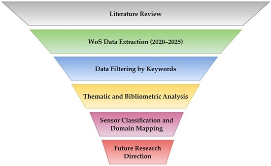 To answer the RQs, this paper analyzes specialized works through a detailed literature review and subsequently conducts a systematic analysis based on quantitative and qualitative research methods. Beyond the specialized literature review, the paper employs WoS analysis to identify IoT domains. Figure 1 presents the overall workflow of this study. For this, a search is conducted in this database corresponding to the period between 1 January 2020 and 30 April 2025, using the query TS = (“IoT sensors”) AND PY = (2020–2025), with the primary goal of identifying the most frequent domains associated with IoT sensors. The authors classified the fields into smart cities, wearable devices, industrial IoT, smart homes, environmental monitoring, healthcare IoT, and smart mobility.